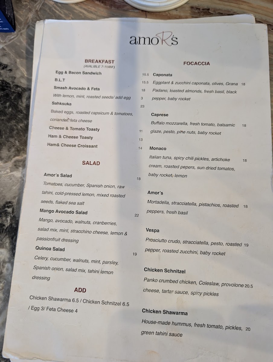 The menu at Amor’s features a selection of salads, cocktails, and champagne & sparkling wines, catering to a variety of light meal and beverage preferences. Salads include options such as Amor's Salad, Mango Avocado Salad, and Quinoa Salad, providing fresh and wholesome choices for a light lunch or casual dining.