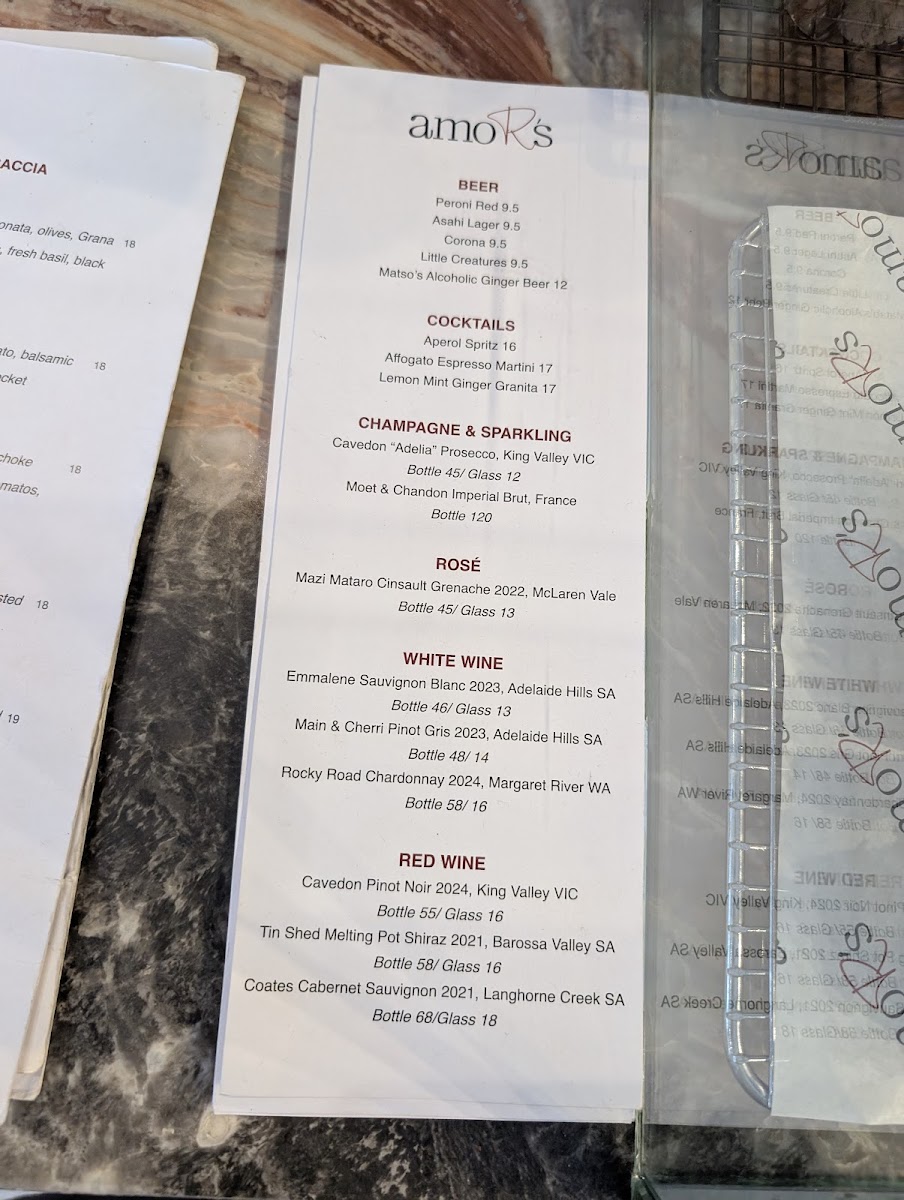The drinks menu includes a range of cocktails like Aperol Spritz, Affogato Espresso Martini, and Lemon Mint Ginger Granita, offering both classic and creative options suitable for coffee breaks or social occasions. Additionally, the champagne and sparkling section features varieties such as Cavedon "Adelia" Prosecco from King Valley and Moet & Chandon Imperial Brut from France, available for those seeking sparkling wine selections.